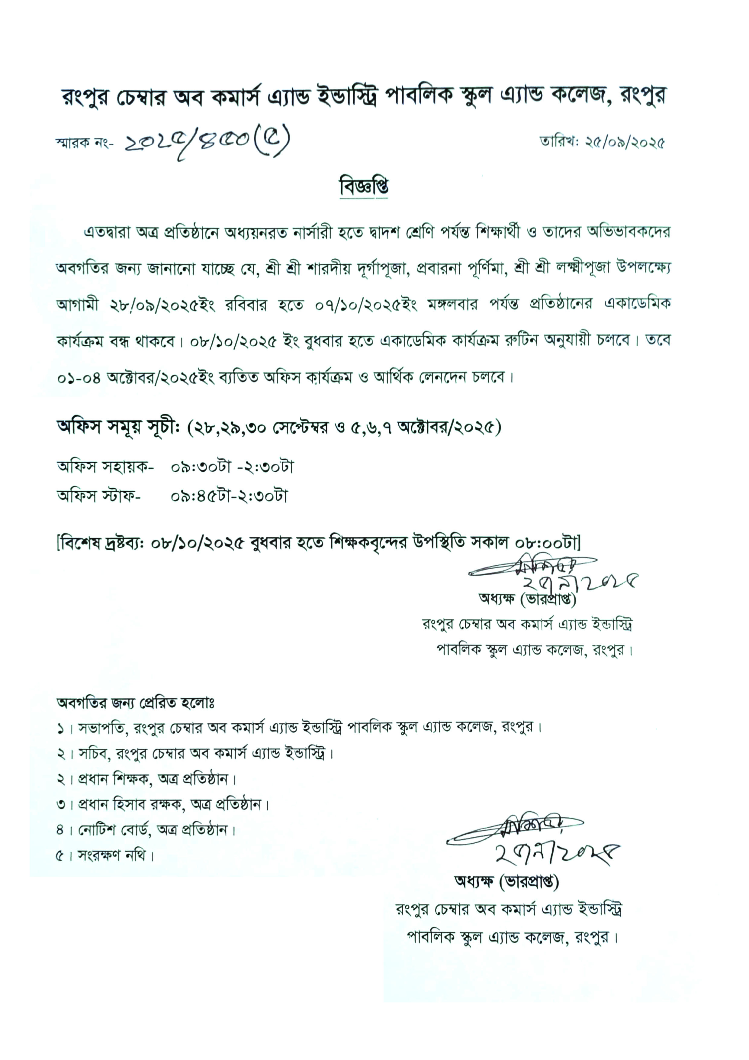 শ্রী শ্রী দূর্গা পূজা, বিজয়া দশমী, ফাতেহা-ই-ইয়াজদাহম, প্রবারণা পূর্নিমা ও শ্রী শ্রী লক্ষ্মী পূজার ছুটি